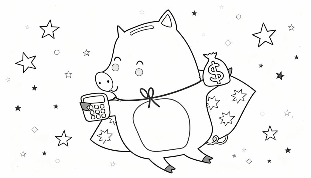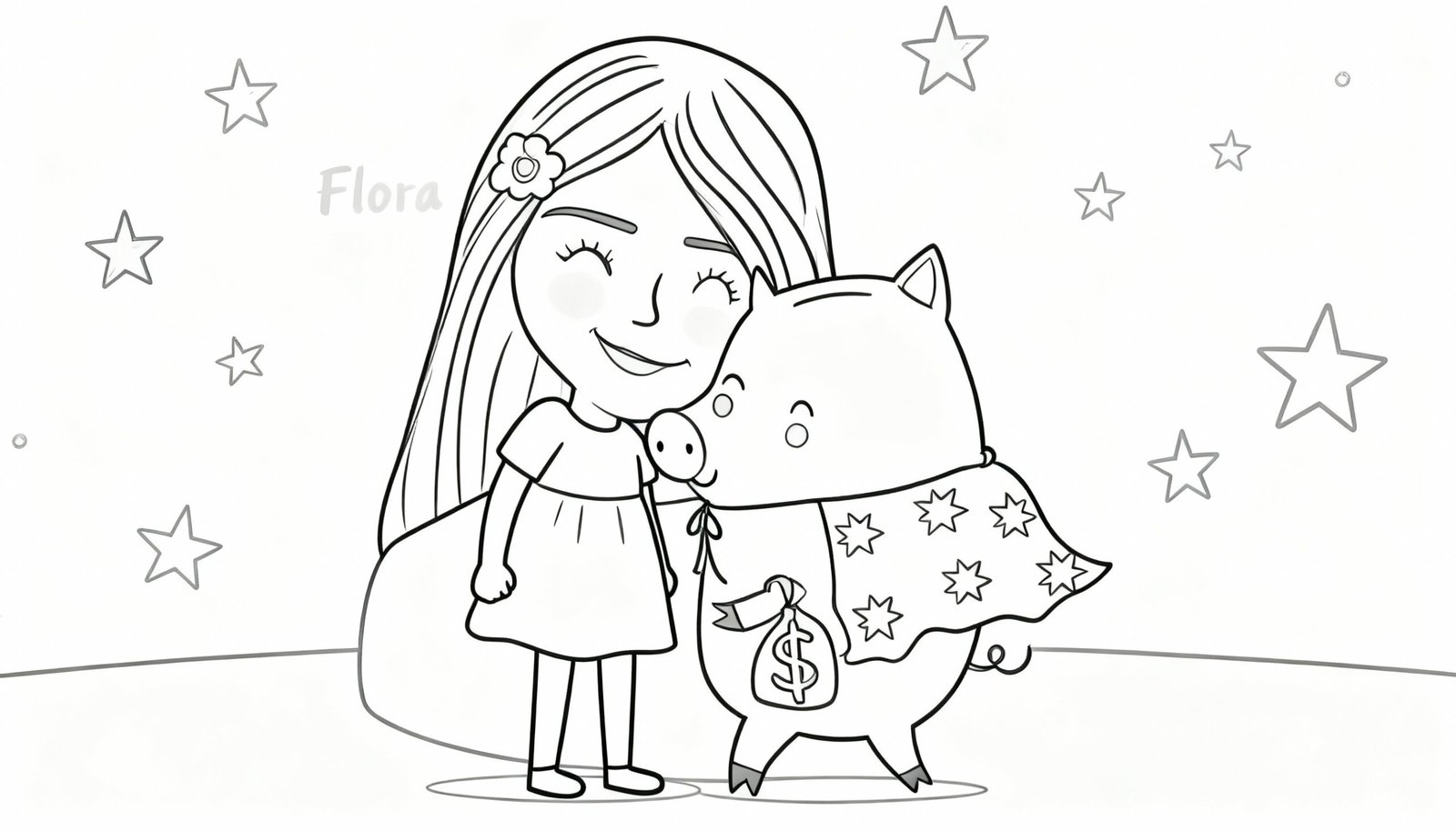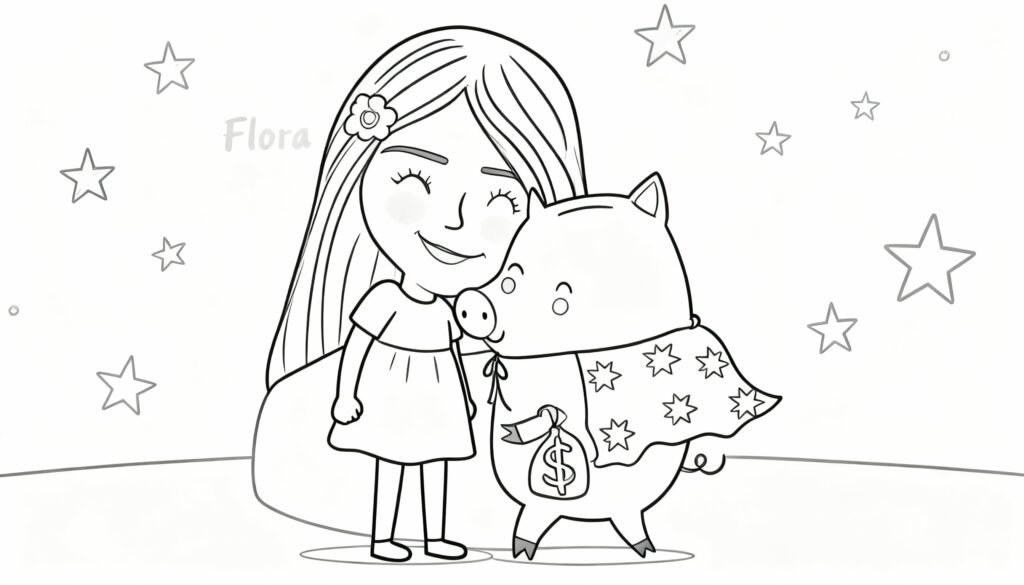 En este dibujo, Flora aparece junto a Aurora, la chanchita que guarda deseos, secretos y metas. Es una escena tierna que invita a hablar del cariño, la confianza y la idea de que ahorrar también es un acto de amor hacia nuestro futuro.