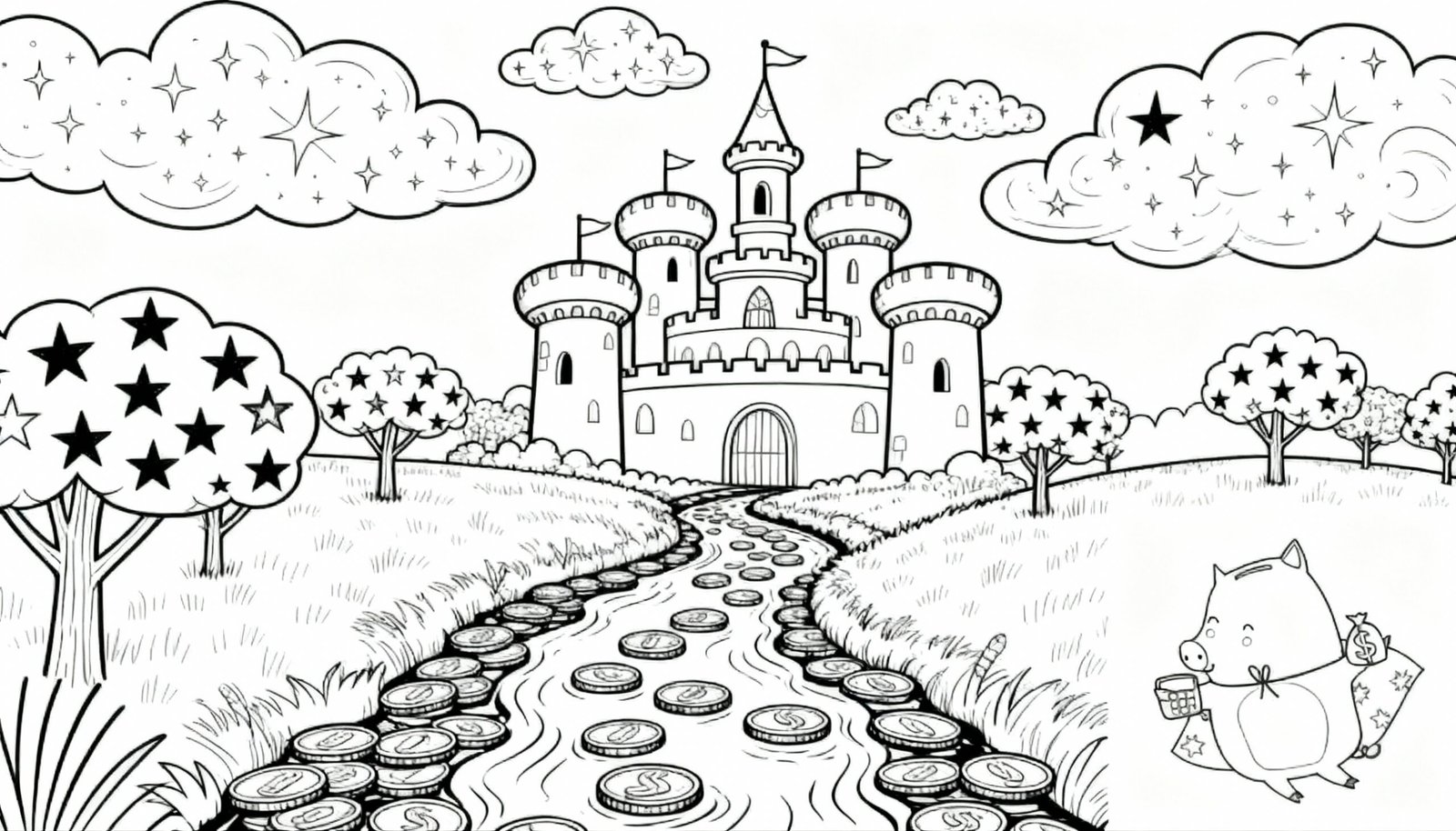 Un paisaje lleno de magia: árboles estrellados, un río de monedas y el gran castillo donde todo es posible. Este dibujo es perfecto para dejar volar la imaginación y hablar de metas grandes, de esos sueños que llevan tiempo, constancia y pequeños pasos.